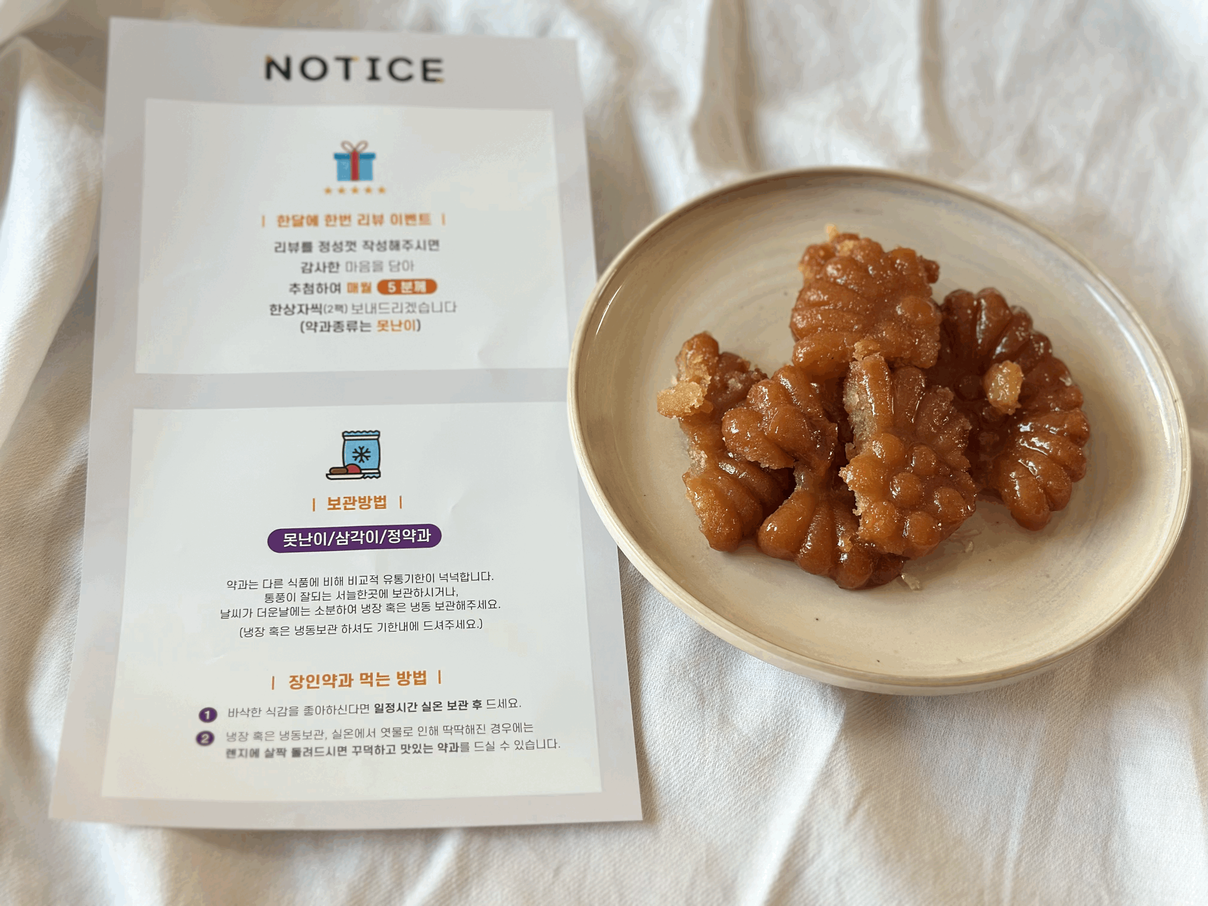 한입에 쏙 들어가는 사이즈라 먹기 편하고, 바삭한 식감이 더 잘 느껴지고 다른 약과들과 다르게 기름이 안느껴져서 너무 맛있었어요 (못난이 약과도)