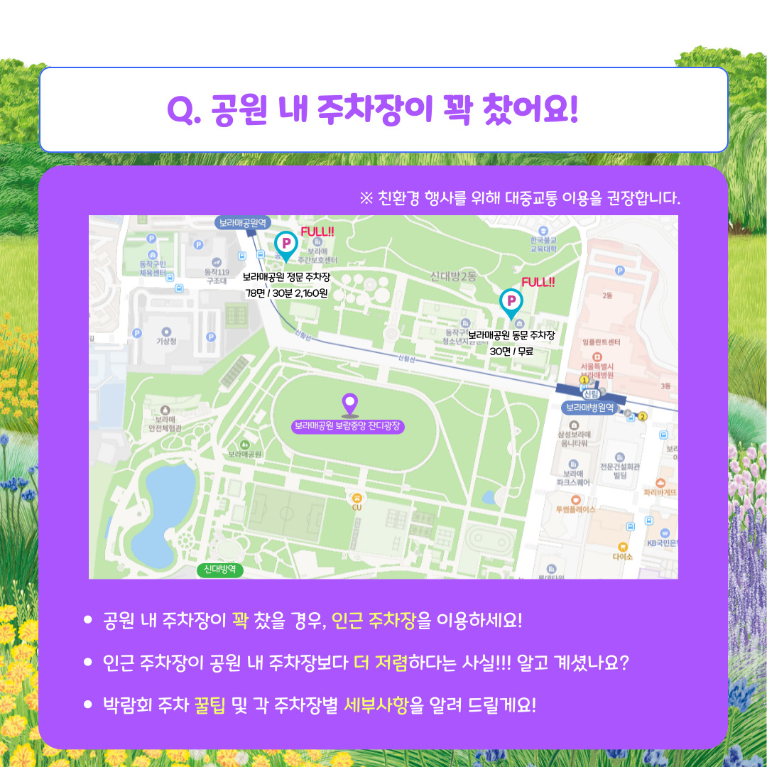 - 신림선 보라매공원역 하차, 1번 출구 보라매공원관리사무소 까지 도보 3분 소요. 보라매병원역 하차, 1번출구 보라매공원 동문까지 도보 1분 소요
